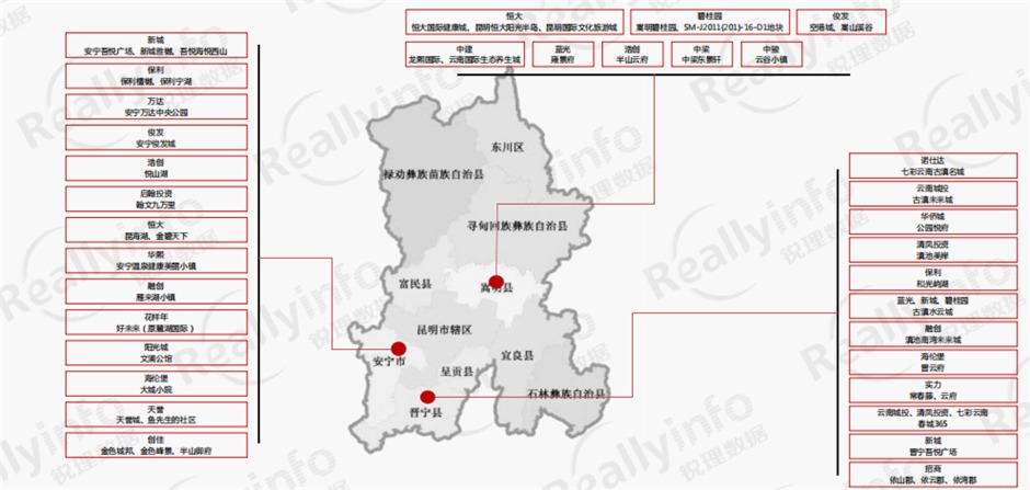 昆明近郊三區縣中土地成交與供應量做大的是安寧,安寧土地銷售額占三區縣銷售總額78%,是近郊房地產開發的主要區域