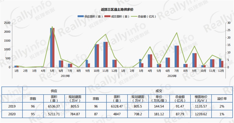【近郊土地市場】2020年近郊土地供應面積與成交面積較2019年均有下滑,分別下降20%、23%,但成交總金額僅 下降4%,而樓面地價較去年增長9%,溢價率1%,由此可看出近郊土地市場保持較高的活力。