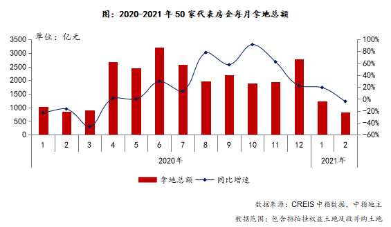房企拿地分化顯著,50家代表企業(yè)拿地額同比下降。2021年2月,50家代表房企拿地總額同比下降4.0%。2月,受新年影響,企業(yè)拿地規(guī)模通常有所下降。具體來看,部分現(xiàn)金流較穩(wěn)定企業(yè)拿地態(tài)度依舊保持積極,如萬科、招商蛇口、綠城等,1-2月拿地同比均增長顯著;濱江集團(tuán)、榮盛發(fā)展等企業(yè)銷售額均越過千億,為加速規(guī)模化發(fā)展,拿地力度不減,1-2月拿地亦比較亮眼。