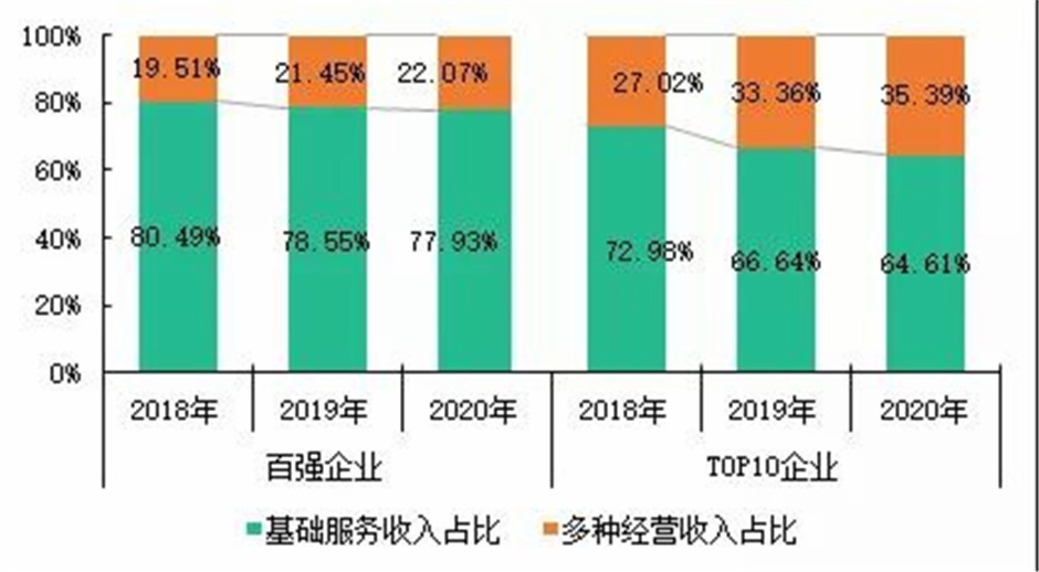 2020年,百強企業積極穩固基本盤,基礎物業服務收入繼續增高,達到9.14億元,同比增長11.92%,業績貢獻度為77.93%;多種經營收入均值2.59億元,同比增幅達16.08%,增長彈性更高。
