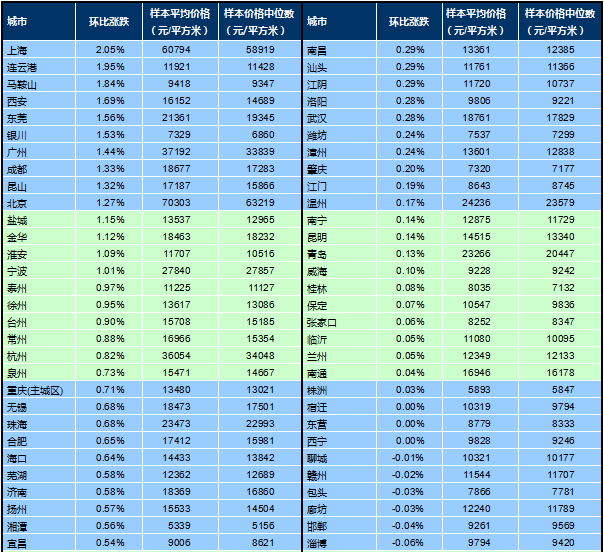 上漲2.05%,漲幅最大;廣州、成都、北京漲幅介于1.0%-1.5%之間;杭州、重慶(主城區(qū))、南京漲幅在0.5%-1.0%之間;武漢漲幅0.28%;天津、深圳環(huán)比跌幅在0.5%以內(nèi)。