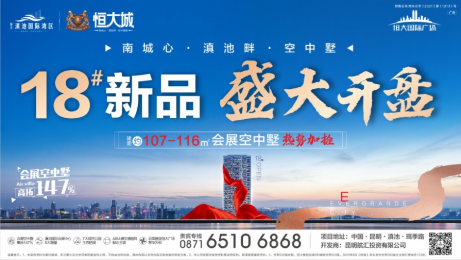 當紅春城,再綻會展!昆明恒大城18#新品,明日盛大開盤,建面約107-116㎡空中墅,恭迎親臨品鑒!