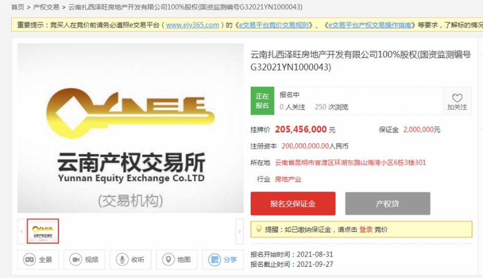 8月31日,云南省康旅控股集團有限公司在云南產權交易網上掛牌轉讓云南扎西澤旺房地產開發有限公司100%股權,起拍價為2.05億。據查,云南扎西澤旺房地產開發有限公司旗下開發有匯榮時代廣場,該項目已更名晶都商業中心,位于關上銀海尚御西側,2014年接手后近期已啟動開發。