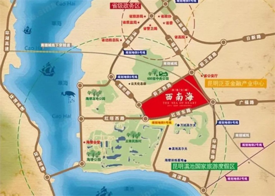 西南海上位于滇池度假區,廣福路、前衛西路、滇池路及紅塔東路之間,緊鄰公園1903商圈,項目規劃面積上千畝,是滇池度假區為數不多的低密住宅樓盤之一。