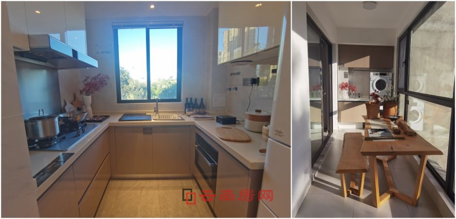 俊發(fā)城精裝實(shí)體樣板間展示的廚房和陽(yáng)臺(tái)