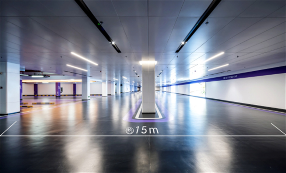 值得一提的是,山海灣8號配套約15米寬雙向四車道的地下車庫,將車輛有效分流,提高通行效率,同時采用3.00mm水性聚氨酯砂漿自流平+超耐磨聚氨酯罩面,地面涂料選用德愛威品牌,并采用BIM技術,使縱向凈高達到約2.9米,約5.3m*2.6m的闊綽車位空間,細節處盡現豪華本色。
