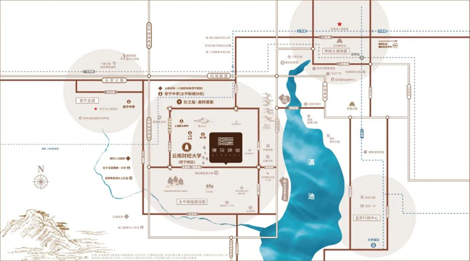 建投璞御位于安寧太金路(普融路)云南財經大學安寧校區旁,項目規劃總面積334畝,總建面57萬方,容積率低至1.61,綠地率約40%,總戶數2252戶,是通泰置業進入太平新城的首個作品。