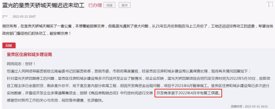 日前,藍光天嬌城四期(天樾)終于有了復工時間表。呈貢住建局回復稱,項目工程主體已全面封頂,剩余室外總平、地下室及室內部分收尾工程,經多次約談及督促開發(fā)商按照《商品房購銷合同》約定時間交房,開發(fā)商承諾4月中旬對項目進行復工續(xù)建。