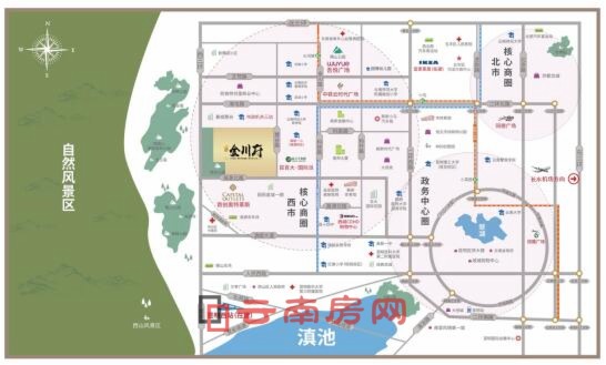 義承金川府距首創奧萊直線距離約500米,周邊高新一小,延安醫院高新醫院等豐富配套,項目距地鐵4號線大河埂站點約2.3公里,旁邊還有海源寺車場,多條公交途經,公共交通便利。此外,西北新城的新城吾悅廣場、宜家家居、云南阜外醫院等都在項目5公里范圍內。