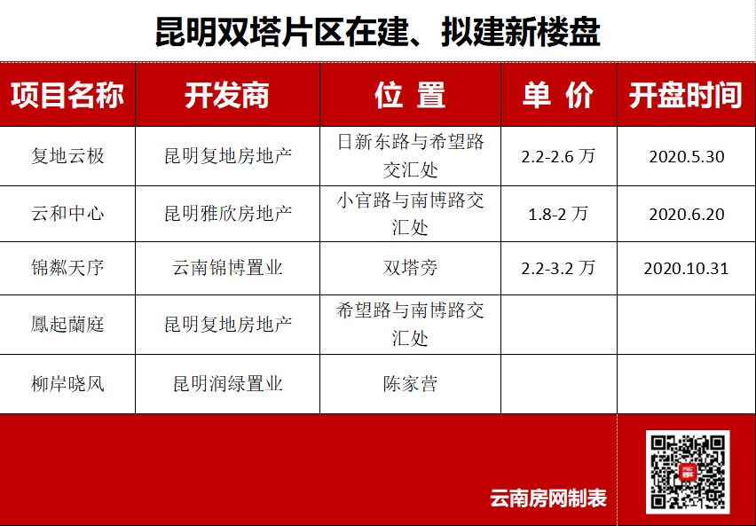 雙塔片區是2019年重新規劃的,原來的金融產業功能被放棄,改為以高檔居住為主,同年,片區土地開始出讓,上海復地、雅居樂、綠地、龍湖、新希望、綠城等國內知名房企先后殺入,目前已有復地云極、雅居樂和綠地合作的云和中心、龍湖和新希望合作的錦粼天序三個項目在售,是目前昆明市場公認的三個高端樓盤,產品售價都摸高到2萬一線,最貴的賣到差不多3萬。最近亮相的綠城鳳起蘭庭,檔次和售價比起前面三個樓盤來估計也只高不低。