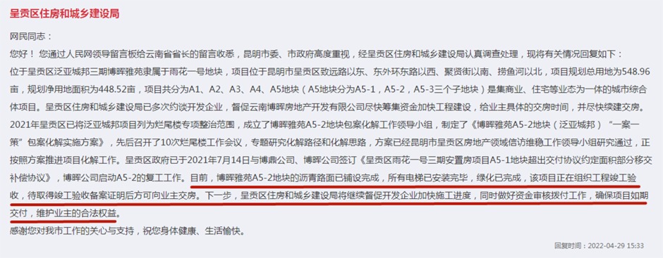 為盡快實現復工,呈貢區最終確定按照分期施工、業主自救方案推進復工續建。目前,項目已實現復工續建,業主自救款項分攤方案已獲高票表決通過,正籌集自救款項。