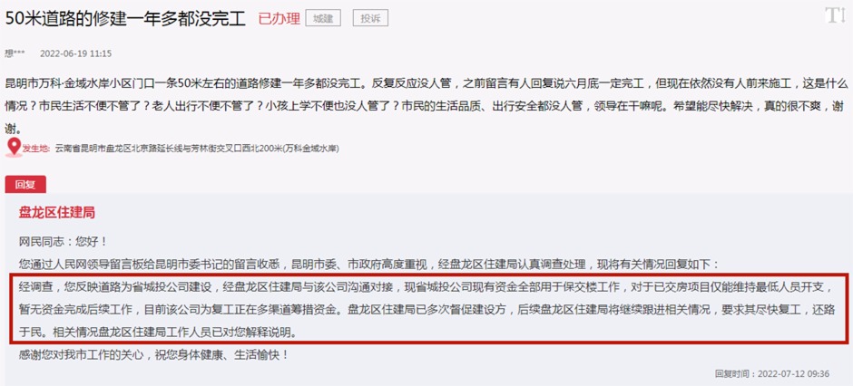 對此,盤龍區住建局回復稱,該道路由省城投公司建設,經溝通對接,得知省城投公司現有資金全部用于保交樓,對已交房項目僅維持最低人員開支,暫無資金完成后續施工,目前,該公司正為復工多渠道籌措資金,區住建局也將繼續跟進,要求其盡快復工。