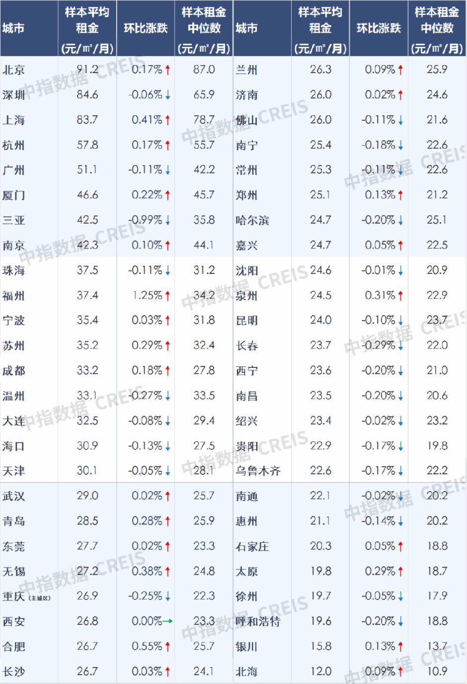 50城住宅平均租金環(huán)比漲跌幅分析