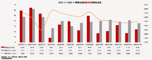 根據國家統計局數據,2022年昆明新房價格指數自3月份起就開始出現環比下跌的情況。在經歷8連跌以后,終于在11月止住跌勢,迎來0.2%的環比微漲。另據克而瑞市場數據,主城11月新房住宅成交均價為13525元/平,環比上月微漲1.4%。