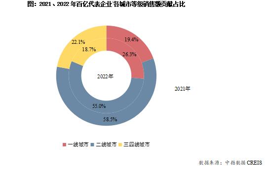 一、二線城市占比超八成,一線城市成交占比顯著提升。2022年,百億企業重倉一、二線城市,50家百億代表企業的一、二線城市業績貢獻合計占比為81.3%,較2021年上升了3.4個百分點,其中,一線城市銷售額占比較上年增加6.9個百分點至26.3%,市場需求支撐度較強;受疫情反復、高基數效應或項目停工等因素,部分二線城市市場成交降幅較大,因此二線城市銷售額占比有所下降,但銷售額貢獻仍達到55%;三四線城市市場承壓,2022年業績貢獻率為18.7%,較上年下降3.4個百分點。