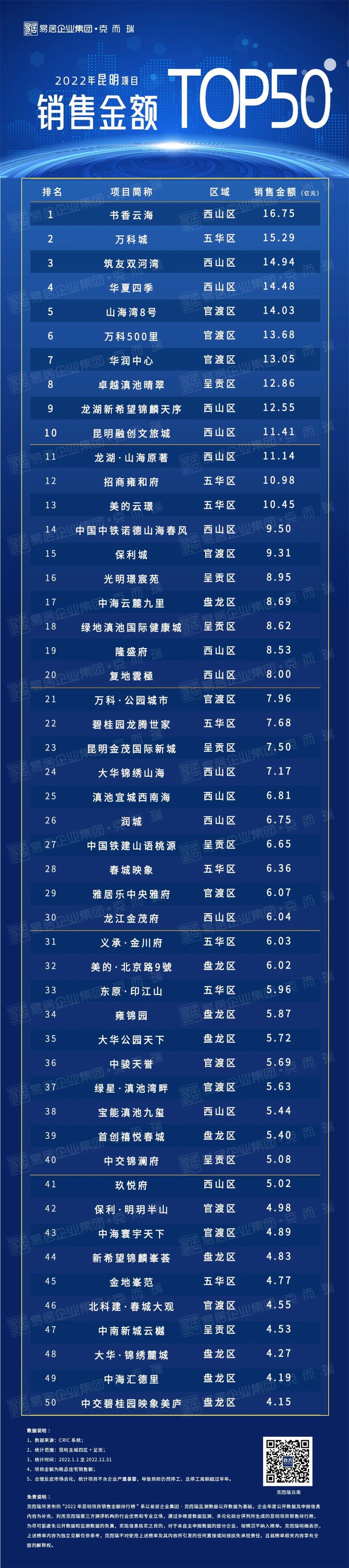 近日,克而瑞發(fā)布了2022年昆明項目銷售金額排行榜TOP50名單,去年昆明僅有13個項目銷售金額破10億,較2021年減少21個,銷售額TOP50樓盤的入圍門檻降低到了4.15億元,前10門檻也僅為11.41億元。