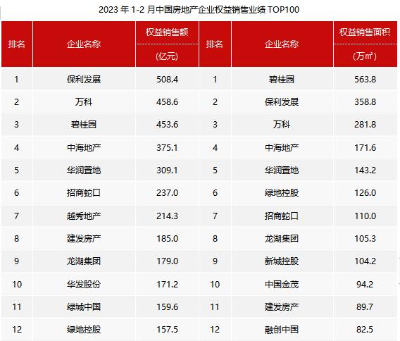特別聲明:房地產企業權益銷售數據統計是以2023年1月1日-2月28日期間銷售的商品房為統計口徑,主要依據CREIS中指數據在各地的銷售監測數據,并參考當期總體經營情況和推盤去化情況進行分析統計;對于少數沒有在監測范圍內的城市或項目,由企業提供相關證明文件,經課題組對數據進行嚴格審核,也納入統計范圍。本報告僅供參考,課題組不對使用報告及其內容所引發的任何直接或間接損失承擔責任。