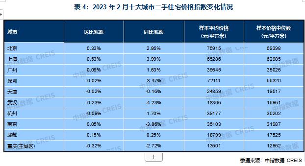 根據(jù)百城二手住宅價格指數(shù)對北京、上海等十大城市樣本調(diào)查數(shù)據(jù)顯示,2023年2月十大城市二手住宅平均價格為40280元/平方米,環(huán)比止跌轉(zhuǎn)漲,上漲幅度為0.13%。十大城市中,5個城市環(huán)比上漲,5個城市環(huán)比下跌。具體來看,上海環(huán)比上漲0.53%,北京上漲0.33%,成都上漲0.15%,廣州、南京漲幅在0.1%以內(nèi);重慶(主城區(qū))下跌0.32%,武漢下跌0.23%,杭州、天津、深圳環(huán)比跌幅均在0.1%以內(nèi)。