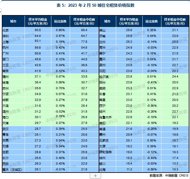 2023年2月,全國50個城市住宅平均租金為36.7元/平方米/月,環(huán)比上漲0.27%,同比下跌1.53%。