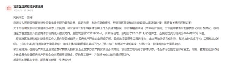 回復中還提到:彩云城晴灣小區房地產開發企業現正在和有實力的開發企業及東方資產商談項目合作開發,項目施工現場處于停滯狀態,待合作協議簽訂后即可復工。官渡區住房和城鄉建設局表示,將督促房地產開發企業多渠道籌措資金,盡快復工復產。