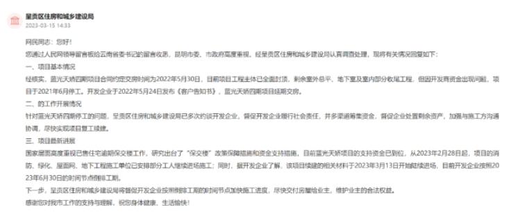3月15日,呈貢區住房和城鄉建設局回復稱:經核實,藍光天嬌城四期項目合同約定交房時間為2022年5月30日,目前項目工程主體已全面封頂,剩余室外總平、地下室及室內部分收尾工程,但因開發商資金出現問題,項目于2021年6月停工。開發企業于2022年5月24日發布《客戶告知書》,延期交房。