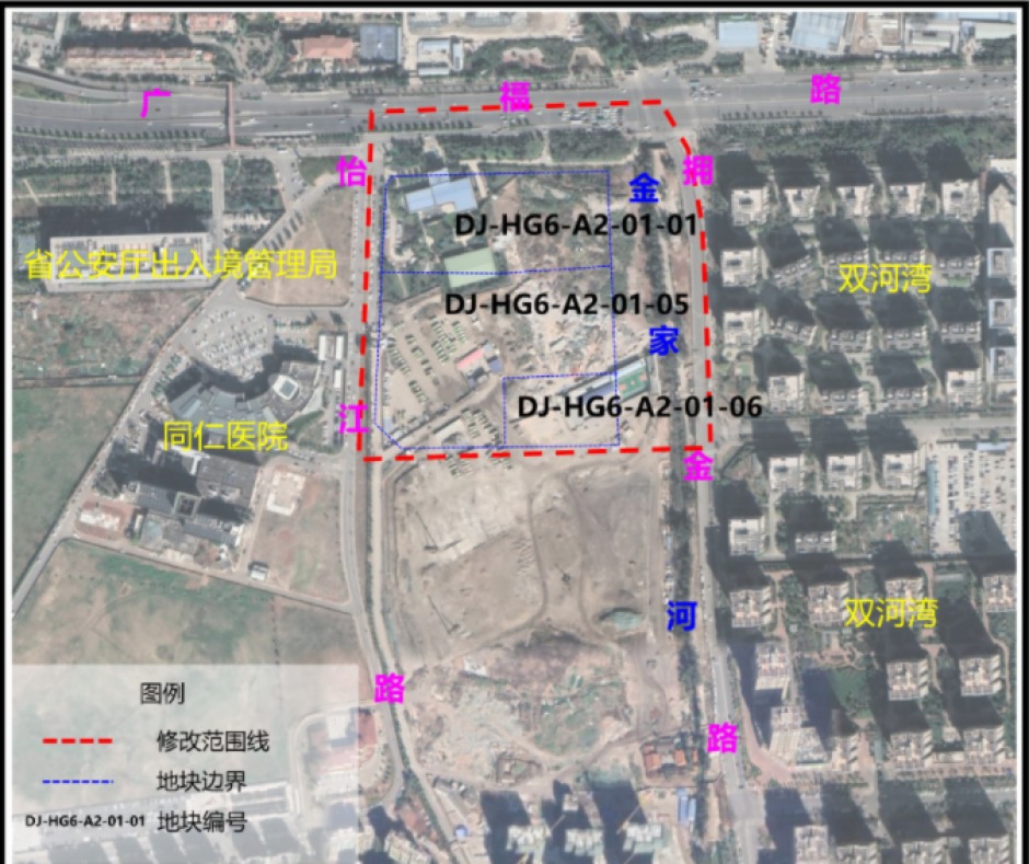 金河二期城改項目A1地塊北臨廣福路,東臨擁金路,西臨怡江路、同仁醫院,規劃范圍約155畝,凈用地約121畝。此次調規將1宗占地約30畝的商業用地和1宗占地約46畝的住宅用地合并為一塊商住混合用地。