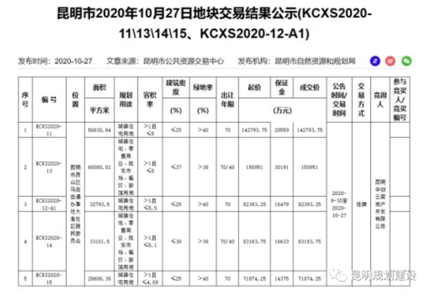 市自然資源和規劃局網站公告顯示,2020年10月27日昆明華創云房地產開發有限公司共競得5宗地塊。