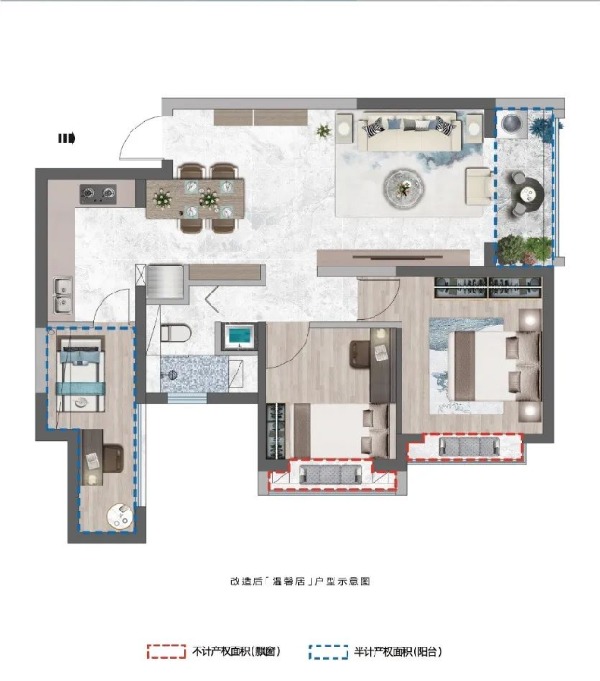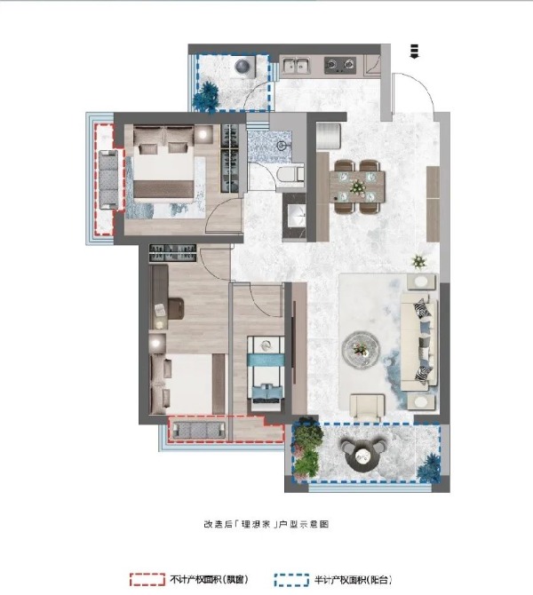 建面約92平的戶型,其實本來也是雙陽臺設計,不過改造則是將拓展的空間設定在了靠近廚房的陽臺,作為項目推售的最大戶型,建面約92平的戶型多改造出來的空間,相較于前兩個戶型就更大一些。