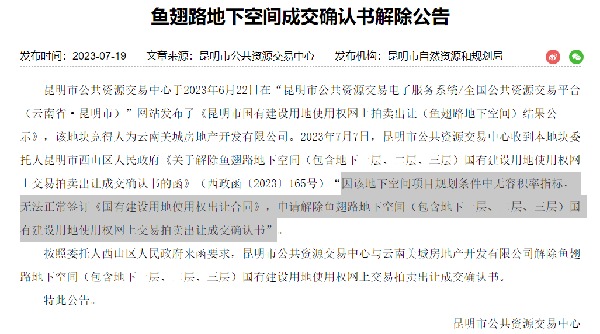 “賣”出去的土地,還能解除交易?近日,昆明市公共資源交易中心發布公告,由于規劃條件中沒有容積率指標,云南美城房地產開發有限公司于6月22日競得的魚翅路地下空間無法正常簽訂用地使用權出讓合同,由西山區政府申請解除了成交確認書,也算是件稀奇事了。