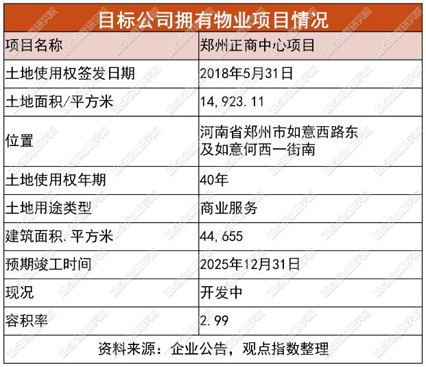 標的公司正在開發的項目為鄭州正商中心,項目建筑面積44,655平方米,為商用性質,預計于2025年底完工,此外在出售時,標的公司對賣方還存在1.45億元欠款,需要在6個月內對賣方即河南正商置業進行悉數償還。
