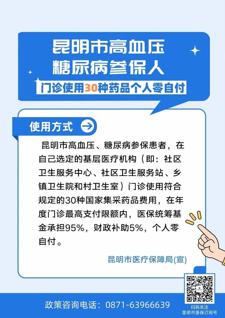 7月26日,昆明市醫(yī)療保障局發(fā)布昆明市高血壓、糖尿病(以下簡(jiǎn)稱(chēng)“兩病”)參保人門(mén)診使用30種藥品個(gè)人零自付的政策解讀,患者在選定的基層醫(yī)療機(jī)構(gòu)門(mén)診使用符合規(guī)定的30種國(guó)家集采藥品費(fèi)用,在年度門(mén)診最高支付限額內(nèi),醫(yī)保統(tǒng)籌基金承擔(dān)95%,財(cái)政補(bǔ)助5%,個(gè)人零自付。
