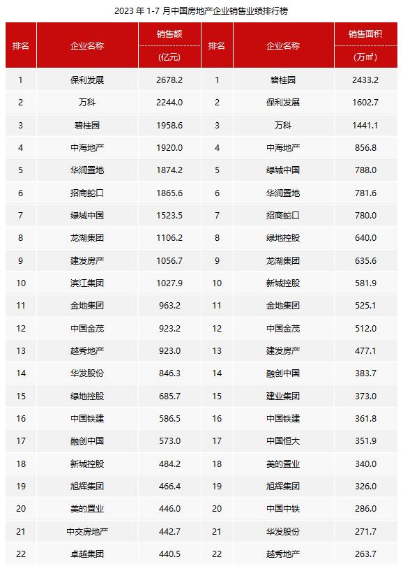 特別聲明:房地產企業銷售數據統計是以2023年1月1日-7月31日期間銷售的并表商品房為統計口徑,主要依據CREIS中指數據在各地的銷售監測數據,并參考當期總體經營情況和推盤去化情況進行分析統計;對于少數沒有在監測范圍內的城市或項目,由企業提供相關證明文件,經課題組對數據進行嚴格審核,也納入統計范圍。本報告僅供參考,課題組不對使用報告及其內容所引發的任何直接或間接損失承擔責任。