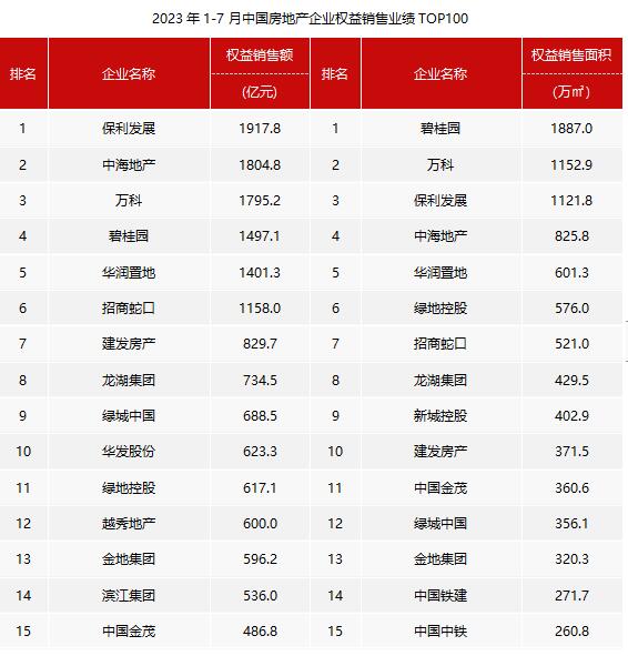 特別聲明:房地產企業權益銷售數據統計是以2023年1月1日-7月31日期間銷售的商品房為統計口徑,主要依據CREIS中指數據在各地的銷售監測數據,并參考當期總體經營情況和推盤去化情況進行分析統計;對于少數沒有在監測范圍內的城市或項目,由企業提供相關證明文件,經課題組對數據進行嚴格審核,也納入統計范圍。本報告僅供參考,課題組不對使用報告及其內容所引發的任何直接或間接損失承擔責任。