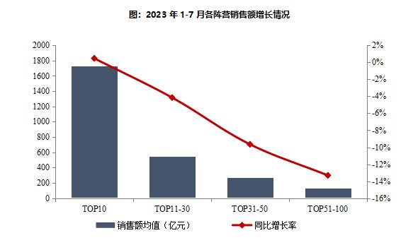 2023年1-7月,百億以上陣營企業數量減少。具體來看,千億以上陣營10家,與去年同期持平,銷售額均值1725.5億元。第二陣營(500-1000億)企業7家,較去年同期減少4家,銷售額均值785.8億元。第三陣營(300-500億)企業20家,較去年同期增加1家,銷售額均值383.5億元。第四陣營(100-300億)企業為48家,較去年同期減少3家,銷售額均值171.0億元。