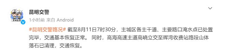 據@昆明交警 消息,截至8月11日7時30分,昆明主城區各主干道、主要路口淹水點已處置完畢,交通基本恢復正常。同時,高海高速主道高峣立交至暉灣收費站路段山體落石已清理,交通恢復。