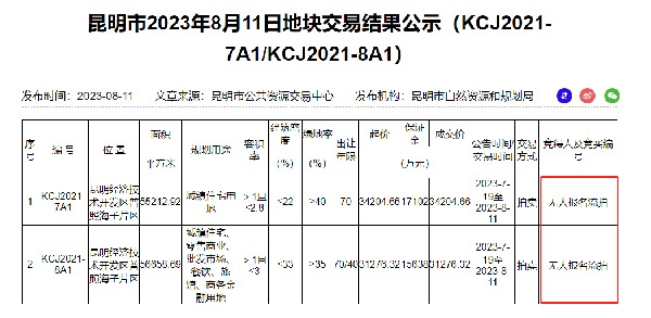 普照海子片區計劃供應的KCJ2021-7-A1和KCJ2021-8-A1號兩宗地塊,總面積約168畝,起拍價約6.55億元,其中: