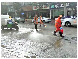 公交集團(tuán)工作人員與環(huán)衛(wèi)工人清洗路面 ■ 都市時(shí)報(bào)全媒體實(shí)習(xí)生 吳少敏