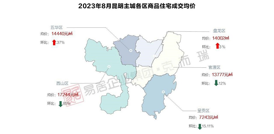 8月,昆明主城五區商品住宅成交均價13335元/㎡,總體是環比持平,但各區的均價漲跌情況不一,盤龍區和五華區上漲,西山、官渡和呈貢環比下降,其中呈貢的降幅最大,達到了15.11%,從7月份的8560元一下降到了7243元。