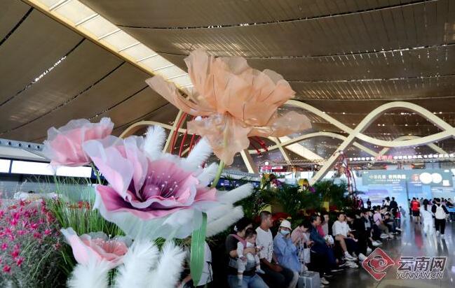 10月6日,中秋國慶黃金周即將結束,在昆明長水國際機場出發大廳,結束假期的旅客帶著云南鮮花和特產有序返程。