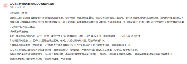近日,有網友在人民網地方領導留言板上咨詢溫泉山谷項目配套的曲一中及醫院的建設事宜。安寧市住房和城鄉建設局、安寧市教育體育局答復稱曲一中高中部目前選址、設計、征地、建設相關工作已統籌實施,計劃于2023年12月31日前取得實質開工,2025年9月份招生。