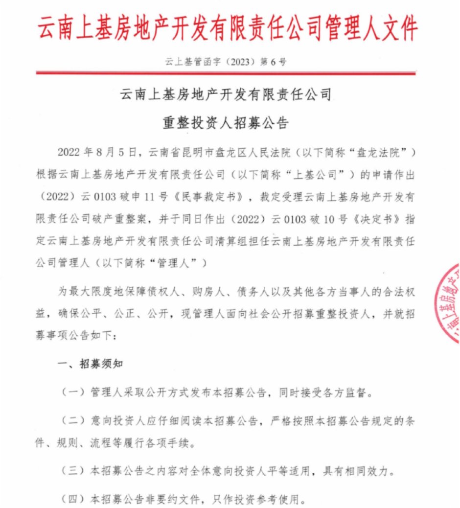 11月1日,上基地產(chǎn)管理人發(fā)布《云南上基房地產(chǎn)開發(fā)有限責(zé)任公司重整投資人招募公告》。