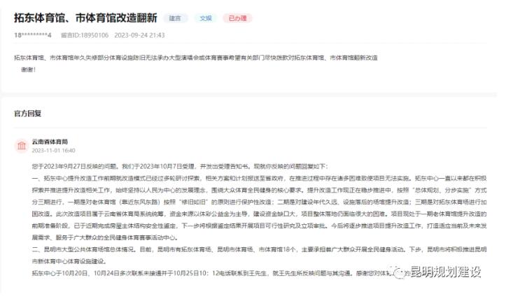 近日,有網(wǎng)友通過地方領(lǐng)導留言板反映拓東體育館、市體育館年久失修,希望盡快翻新改造。對此,云南省體育局回復,拓東中心提升改造工作現(xiàn)正在穩(wěn)步推進中,按照“總體規(guī)劃、分步實施”方式分三期進行,昆明市也將積極推進市新體育中心設(shè)施建設(shè)。