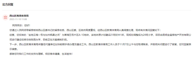 此次西山區教體局的答復,明確了將原21班的初中規劃調整為24班小學,金地云海一號懸而未決的學校也終于有了答案。