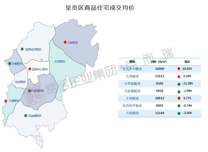 西翥、空港、小哨、大學城、金馬鋪等6個板塊成交均價不到10000元/平方米。成交均價最低的板塊與9月一致,依然是西翥板塊。9月西翥板塊每平方米成交均價超過4800元,10月因春湖小鎮工抵房源集中低價備案,將板塊整體均價拉低至2884元/平方米,環比下降42.34%。