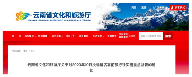 云南省文化和旅游廳關(guān)于對2023年10月投訴排名靠前旅行社實施重點監(jiān)管的通知