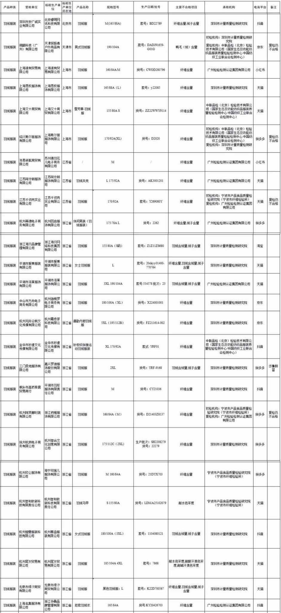 1. 標稱北京睿明網訊科技有限公司生產的羽絨服,款號:BD22789,主要不合格項目:纖維含量,絨子含量;