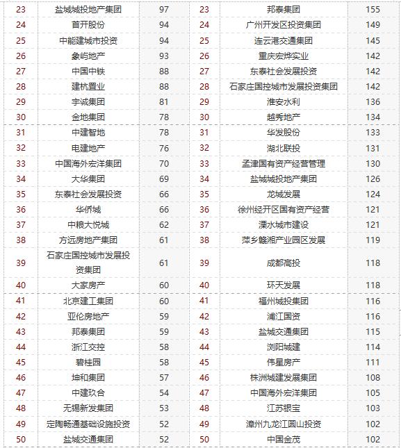 碧桂園、保利發展、萬科、華潤置地、綠城中國、中海地產、招商蛇口、金地集團、龍湖集團、建發房產、中國金茂、濱江集團、中國鐵建、越秀地產、旭輝集團、華發股份、新城控股、遠洋集團、首開股份、美的置業、卓越集團、仁恒置地、中交房地產、雅居樂、電建地產、大悅城控股、中駿集團、路勁集團、武漢城建集團、國貿地產、新希望地產、保利置業、聯發集團、華宇集團、金輝集團、大家房產、大華集團、金隅集團、金融街控股、信達地產、北京城建、星河控股、合生創展、首創城發、中冶置業、建業集團、石榴集團、星河灣集團、榮安地產、君一控股