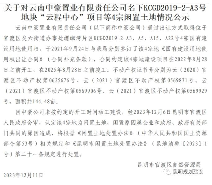 因中豪公司未按約定的開工時間動工建設(shè),經(jīng)2023年12月6日昆明市官渡區(qū)人民政府會審,認(rèn)定該4宗地為閑置土地,閑置原因?qū)倨髽I(yè)和政府、政府有關(guān)部門共同的原因造成,將根據(jù)《閑置土地處置辦法》(中華人民共和國國土資源部令第53號)相關(guān)規(guī)定和《昆明市閑置土地處置辦法》(昆地清整〔2023〕1號)第二十一條規(guī)定進(jìn)行處置。