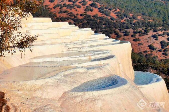 白水臺是由于碳酸鈣溶解于泉水中而形成的自然奇觀,層次分明的田埂勾勒出自然優(yōu)美的梯田線條,清澈透明的水填滿其中,在陽光的照耀下和藍(lán)天的映襯下水光呈現(xiàn)出神秘的蔚藍(lán)色,是中國最大的泉水臺地之一,有“仙人遺田”的美稱,也被游客稱為“東方棉花堡”。