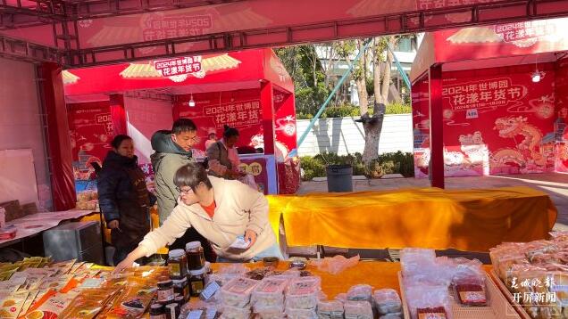 春城晚報-開屏新聞記者在現場看到,昆明世博園花園大道前端兩側分布有80個展位的新春市集,餐食、花卉、文創、非遺、裝飾等應有盡有。其中,文創非遺15個,新春用品、年貨特產25個,特色美食40個。